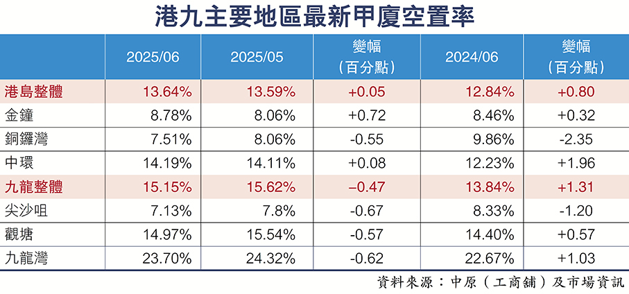 中原(工商舖)寫字樓部董事陳雁樓稱,甲廈空置率方面,6月份港島核心區甲廈空置率錄得約13.6%,按月上升0.05個百分點。各區表現當中,銅鑼灣區甲廈空置率按月及按年改善幅度最大,6月份空置率約7.5%,較上月回落0.55個百分點,按年亦回落2.35個百分點。而金鐘及中環空置率按月則錄得回升至分別逾8.7%及近14.2%。