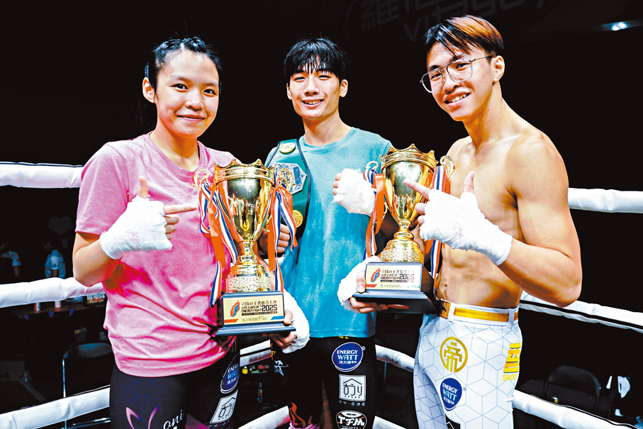 香港原創搏擊品牌Energy Fight昨晚在灣仔修頓場館舉辦「立技之王者慈善大賽」,吸引1,800人到場觀戰,逾70位拳手角逐29場比賽,三位本地搏擊新星(左起)向籽羲、黃智軒及向籽嬴悉數勝出,劍指月尾舉行的日本LEGEND踢拳賽。 公關圖片