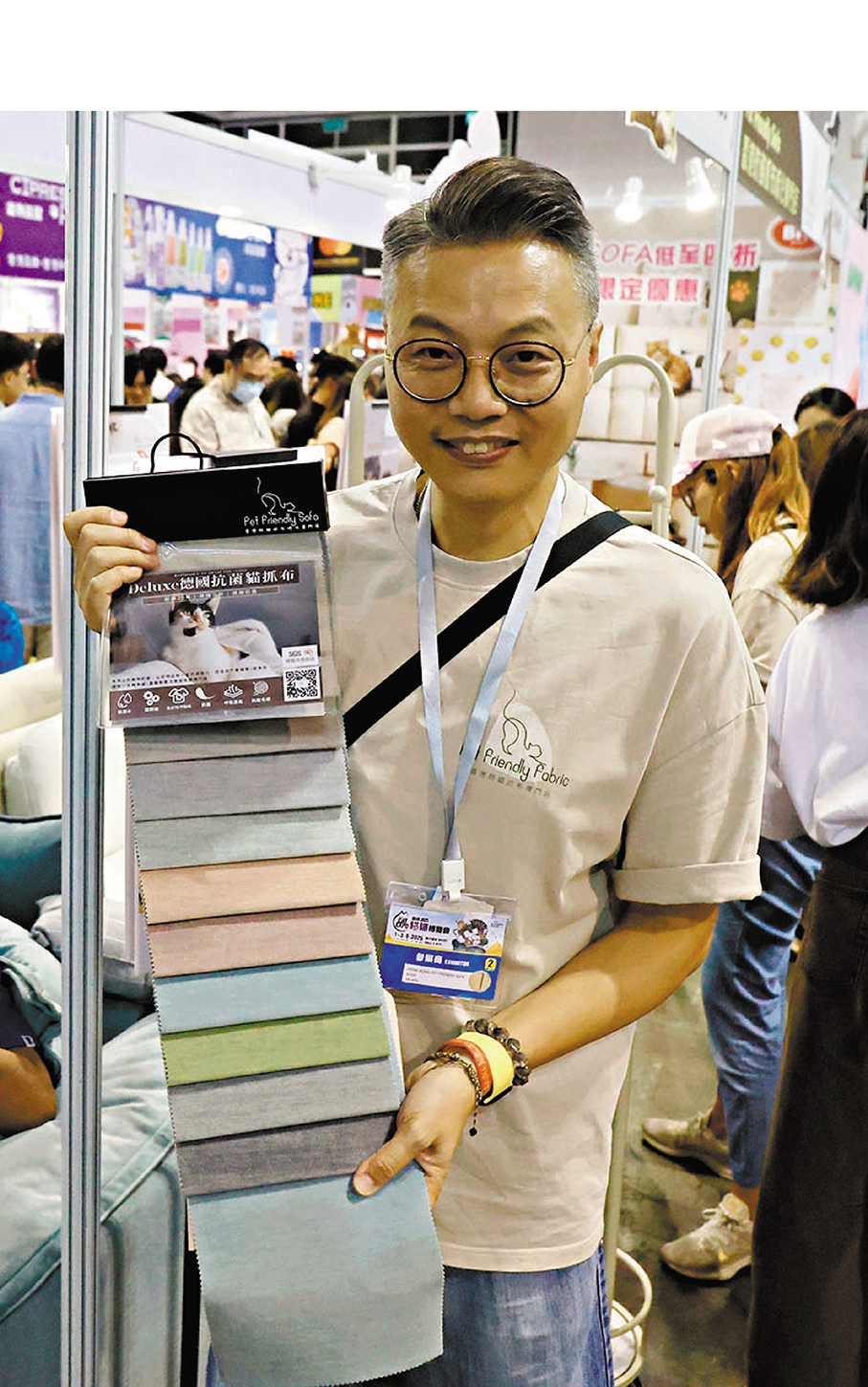 第三年參展的香港防貓抓布梳化專門店,其負責人吳先生表示,今年銷量優於預期,與去年銷售業績持平。他指出,公司不僅提供防貓抓梳化,還有貓主題家居設計,例如融合貓活動空間的電視櫃、貓走道和跳板等,兼顧寵主生活需求與寵物活動軌跡。