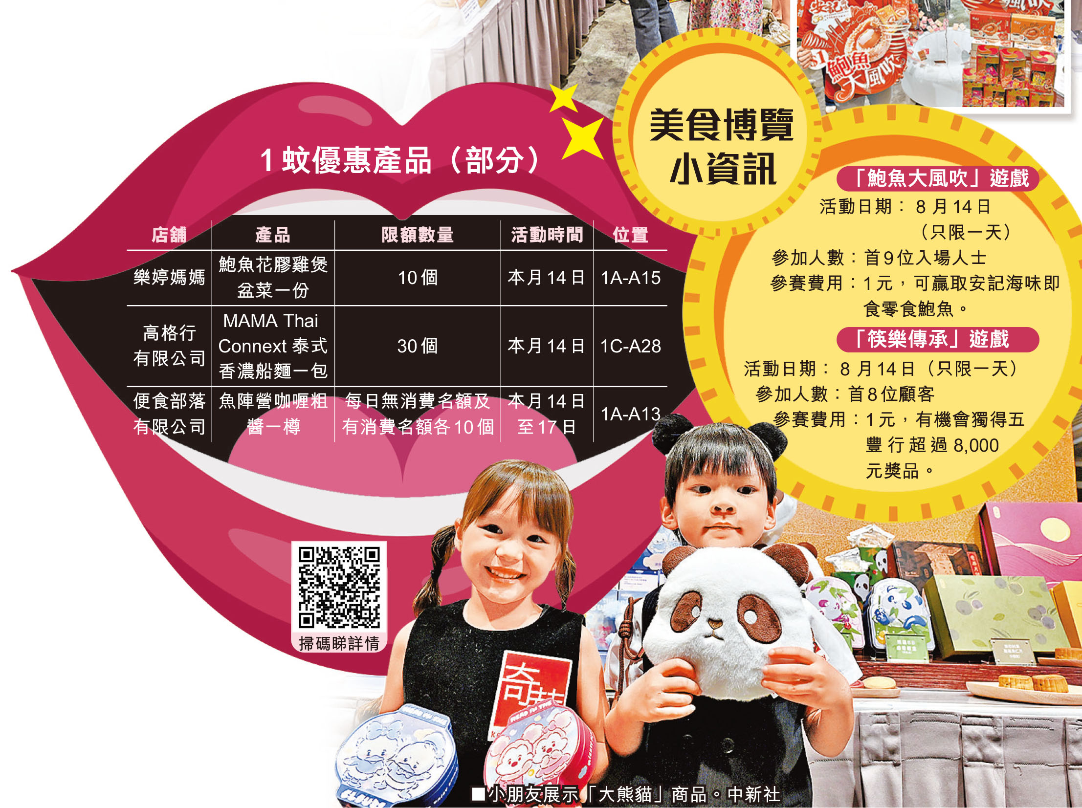 參展商安記負責人潘永熙表示,其主打產品之一即食鮑魚有椒香麻辣、威士忌、醬香等5款口味,定價親民,涵蓋不同消費者,讓更多人能購買。他對消費市道持謹慎樂觀態度,坦言今年上半年消費力較弱,利潤空間收窄,需通過優惠活動和新品作招徠,「是次展會備貨數百箱,相信能滿足需求,保守估計銷售額能按年增長5%。」安記海味今年會推出「鮑魚大風吹」遊戲,將可瓜分共2,304粒即食零食鮑魚。另外,五豐行亦會推出「筷樂傳承」遊戲,送出總值逾1萬元獎品。