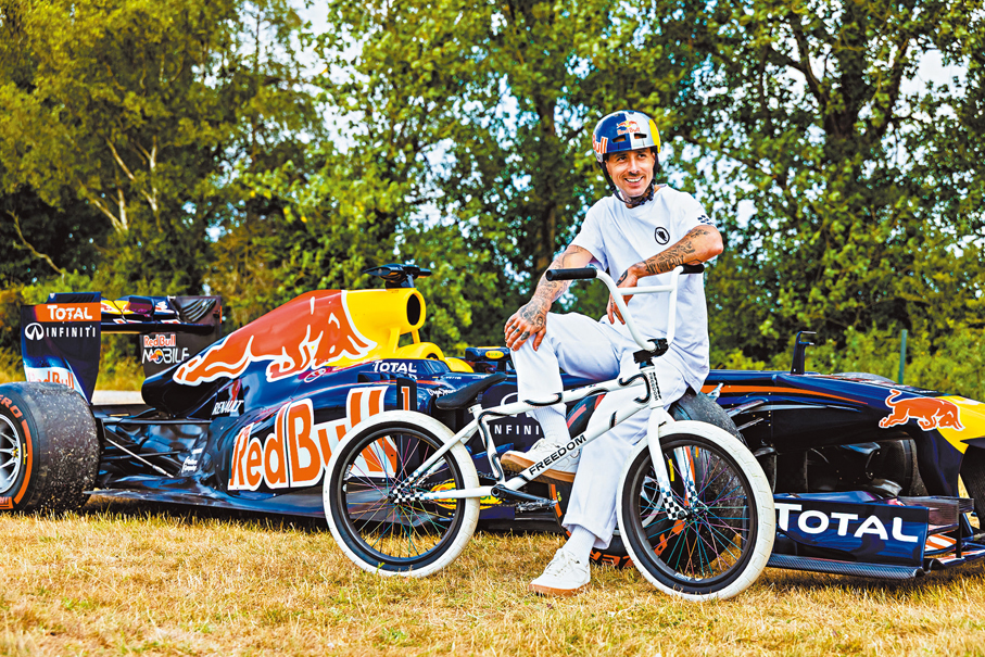 香港文匯報訊 蘇格蘭傳奇BMX車手Kriss Kyle再創極限壯舉,在紅牛最新企劃中成功飛越由維度爾駕駛的F1世界冠軍賽車RB7,挑戰無特效、無替身的極限新高度。跳台由Red Bull Advanced Technologies特製,Kriss Kyle憑無畏無懼、敢於挑戰的精神完成挑戰。