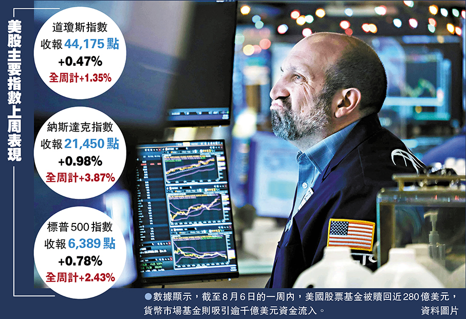 另外,市場對美國降息預期升溫等因素,美國主要股市上周五(8日) 表現平穩,道瓊斯指數上漲206.97點或0.47%,收44,175.61點。納斯達克指數上漲 207.32點或0.98%,收 21,450.02 點。標普500指數上漲49.45點或0.78%,收6,389.45點。