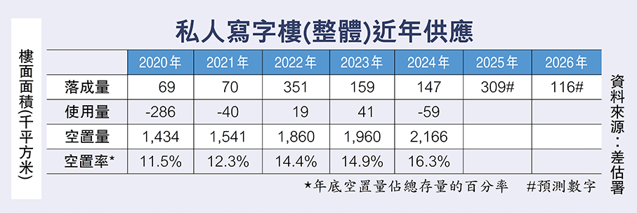 根據差餉物業估價署《2025香港物業報告》顯示,去年底香港整體商廈空置率進一步上升至16.3%,空置樓面達2,331.16萬平方呎,相當於11.6幢國際金融中心2期。早前曾出席施政報告地區諮詢會的香港專業地產顧問商會榮譽會長蔡志忠向香港文匯報記者表示,過去幾年工商物業樓價已大跌40%至60%,加上供過於求,現時每年的吸納量肯定不足以全面支持商廈市道。儘管特區政府早前已暫停推售商業用地,又在洪水橋/厦村新發展區不再規定「商業」用地興建作為辦公室或零售樓面的面積,透過搶企業增加對商廈的需求,最近又放寬商廈可以改作學生宿舍的措施會利好乙、丙級商廈。