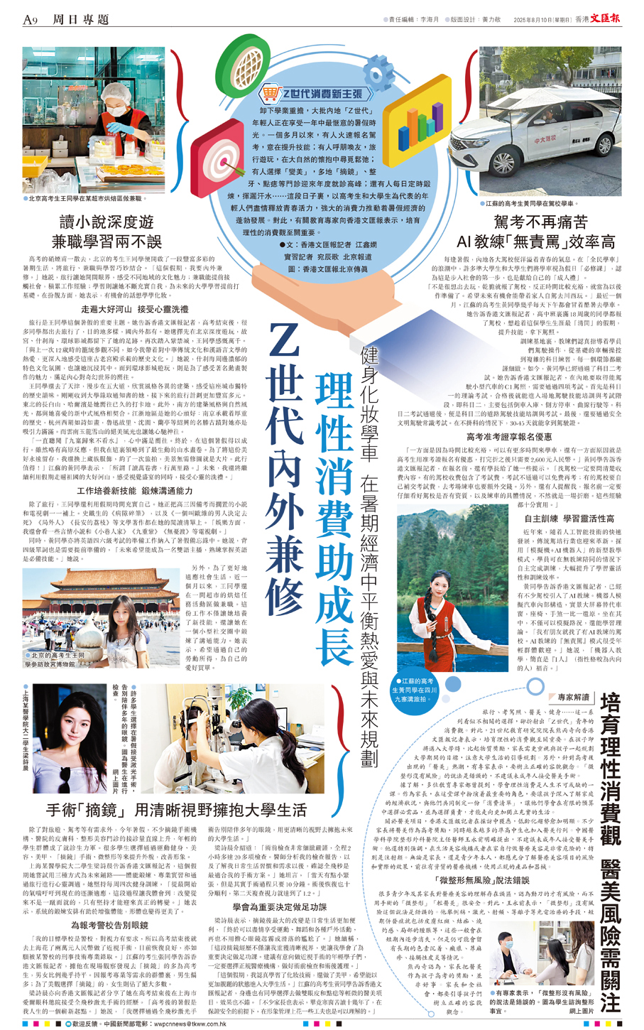卸下學業重擔,大批內地「Z世代」年輕人正在享受一年中最愜意的暑假時光。一個多月以來,有人火速報名駕考,意在提升技能;有人呼朋喚友,旅行遊玩,在大自然的懷抱中尋覓鬆弛;有人選擇「變美」,多地「摘鏡」、整牙、點痣等門診迎來年度就診高峰;還有人每日定時鍛煉,揮灑汗水……這段日子裏,以高考生和大學生為代表的年輕人們盡情釋放青春活力,強大的消費力推動着暑假經濟的蓬勃發展。對此,有關教育專家向香港文匯報表示,培育理性的消費觀至關重要。
