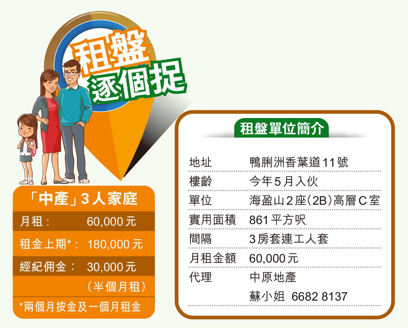 中原地產港島南岸分行高級分行經理蘇苡晴表示,物業向東南,享海景,位處港鐵站上蓋,兩站直達金鐘超級站,交通十分便利。是次放租單位為2座(2B)高層三房套單位,實用面積861平方呎。