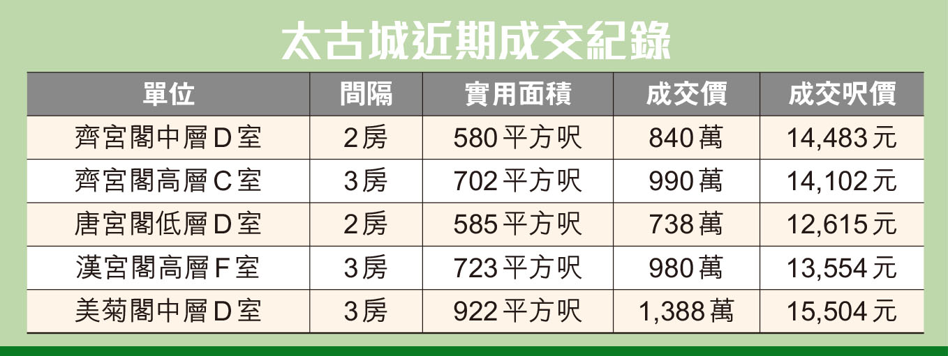 港島東老牌私人屋苑太古城共有9期61座,提供12,696個單位,實用面積由440至1,819平方呎。而是次放盤的金殿台由8座樓宇組成,共有1,664個單位,當中的齊宮閣 (25座) 則共有26層,提供208個單位。太古城交通便利,鄰近港鐵太古站。附近有大型商場太古城中心。雖然屋苑樓齡較高,但單位實用率高達88%,間隔涵蓋2至4房,而3房單位佔約五成,實際面積則由646至1,114平方呎。 買家不乏長線投資收租客。