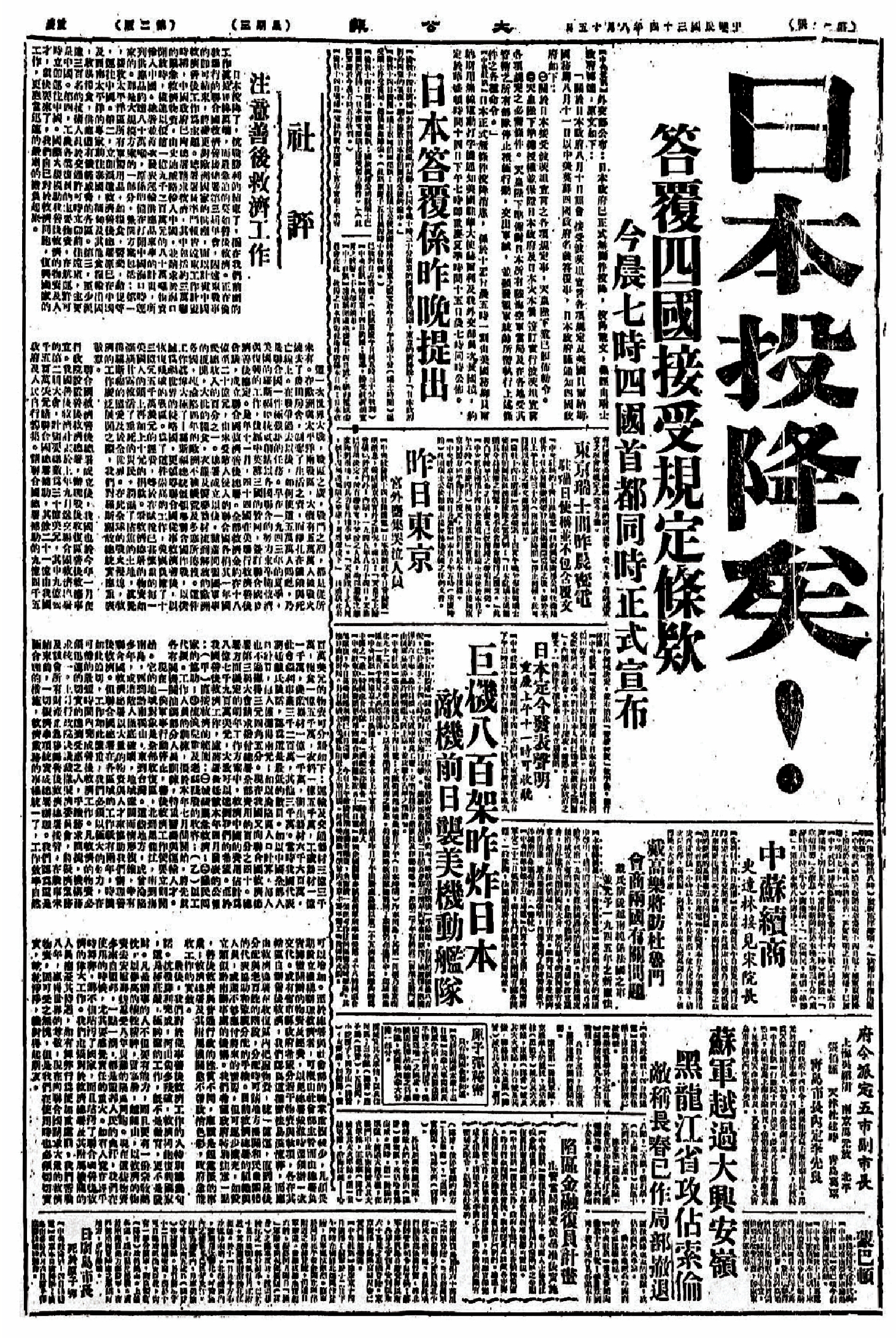 1945年8月15日,重慶「成了一個歡聲的大海!」當天,日本天皇正式宣布無條件投降,一百多年來屢遭列強蹂躪的民族第一次取得了反抗外來入侵的完全勝利。《大公報》記者在《勝利的消息傳遍了全城》一文中生動描繪人們心情:「過年沒有這麼歡喜,中了頭彩沒有這麼多人同聲叫好。人們還惦記什麼呢?物價嗎?去他的!秋老虎麼?稀什麼奇!黃金抽四成麼?全都奉獻也算不了什麼,只要留下盤纏回家!」