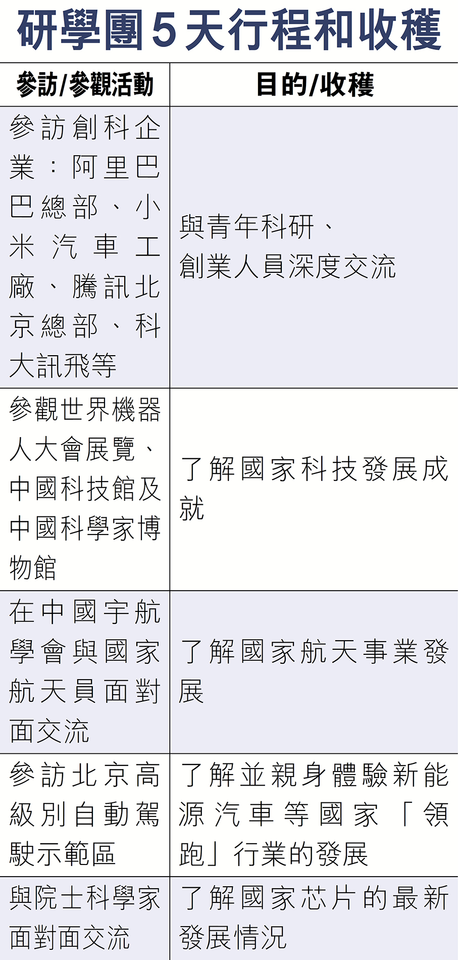 研學團學生都來自太古集團「香港青年科創英才」計劃。5天的參訪行程非常豐富(見表),主題圍繞科創。主辦方表示,此行旨在讓這些對科技發展有濃厚興趣的香港同學進一步了解國家在前沿科技領域的發展情況,助力香港學生在國家科技創新的浪潮中成就夢想。