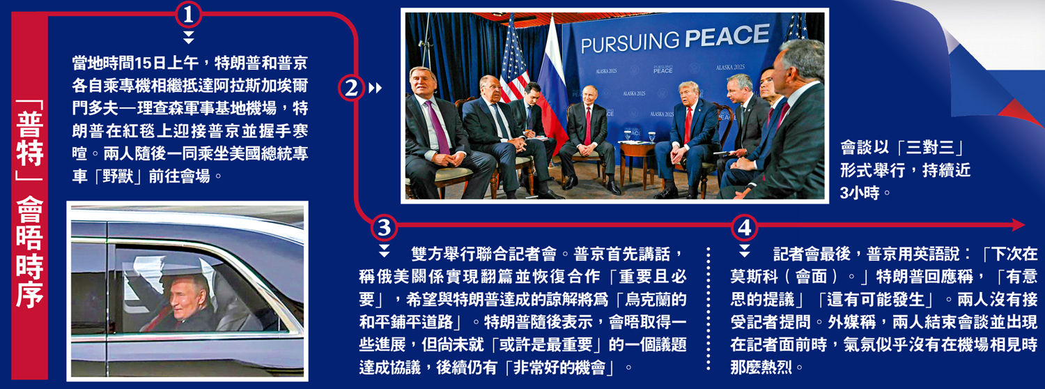 3.雙方舉行聯合記者會。普京首先講話,稱俄美關係實現翻篇並恢復合作「重要且必要」,希望與特朗普達成的諒解將為「烏克蘭的和平鋪平道路」。特朗普隨後表示,會晤取得一些進展,但尚未就「或許是最重要」的一個議題達成協議,後續仍有「非常好的機會」。
