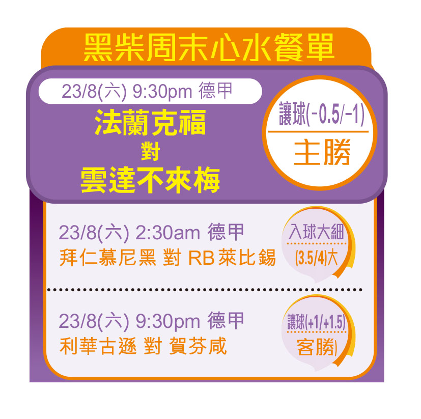 明晚同時舉行尚有利華古遜主場對賀芬咸(NOW 639台周六9:30pm直播)。上屆亞軍利華古遜今夏被拆骨,多名領袖級球員離隊,新帥坦哈格需要時間重建,戰鬥力無法與去季相提並論;賀芬咸上季防線曳排尾四,今夏積極增兵買入多名具分量守將,而且前線回收了外借的阿斯蘭尼、達馬亞及免簽科隆前鋒林柏利,這3名年輕鋒將上季於德乙共貢獻37個入球及19個助攻!今夏迅速帶起賀芬咸鋒線,共踢8場熱身賽全勝,上周德國盃首圈亦4球輕取羅斯托克,今季有權大變身,受讓一球/球半相當值博。