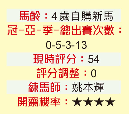 上季曾6度以短距離落敗的「準輝煌」,可惜始終與頭馬無緣。論能力,此駒曾在季初與「嘉應奇兵」、「至尊高超」等三班馬激鬥,應付四班對手本應綽綽有餘,可惜馬匹運氣一般,先後多次抽大外檔搏失,去到季尾體力和狀態都下滑,所以搏足全季都未能交代。由於每次所負不遠,評分沒太多調整空間,也阻礙其贏馬進程。展望今季,希望牠在轉四歲後突破樽頸。