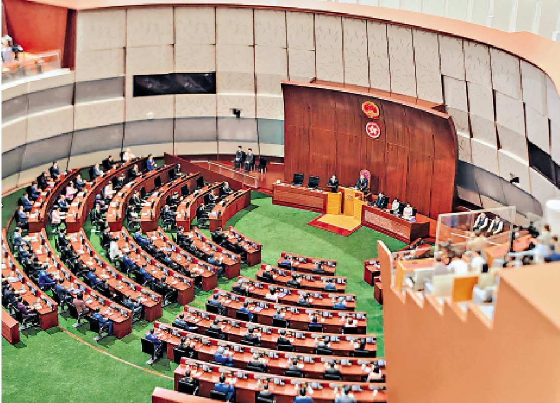 立法會主席梁君彥昨日與記者茶敘,其間立法會秘書處展示了記錄《維護國家安全條例草案》在立法會通過時實況的微型模型(圖),模型將在立法會大樓圖書館內展出,讓公眾參觀。據介紹,模型完全依照當日議事廳會議的情況製作而成,對當日一眾在場人士,包括行政長官李家超與一眾政府高層及全體89名立法會議員的衣着與神情舉止都高度還原,並且可播放特首李家超發言、梁君彥宣布議案獲得通過時的錄音,以及用微型屏幕還原投票結果。梁君彥形容,模型能夠讓參觀者感受立法時的現場氛圍,是「好好嘅國安教育工具」。