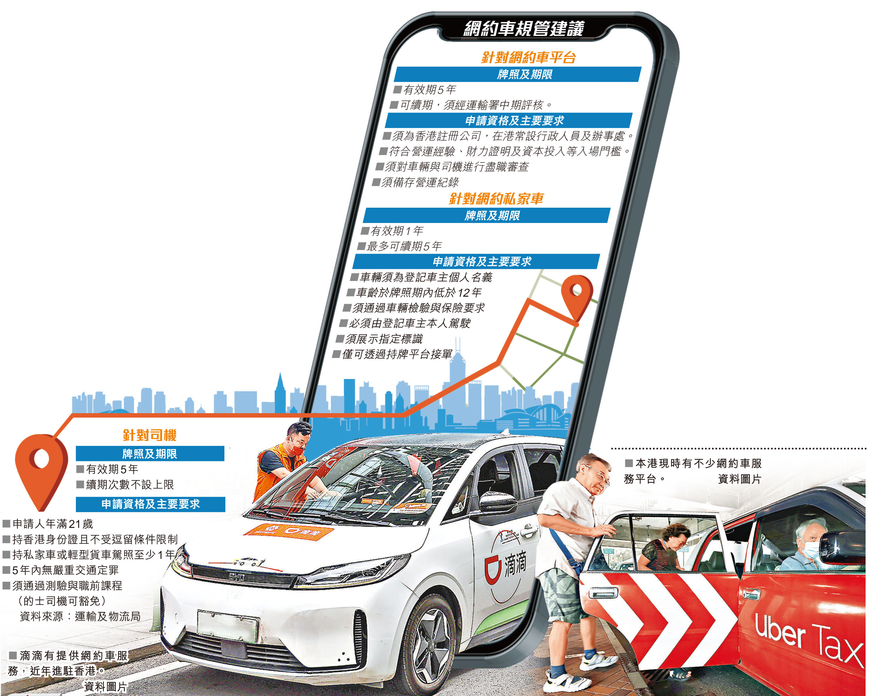 網約車方面,草案指出為防止車輛許可證被變相炒賣,建議車輛須以個人名義登記,並只限登記車主營運。草案亦參考內地及海外相關要求,將車齡放寬至牌照期內不超過12年。牌照有效期為1年,可續期5年。此外,草案亦要求網約車在營運期間須清晰展示標識,方便識別。