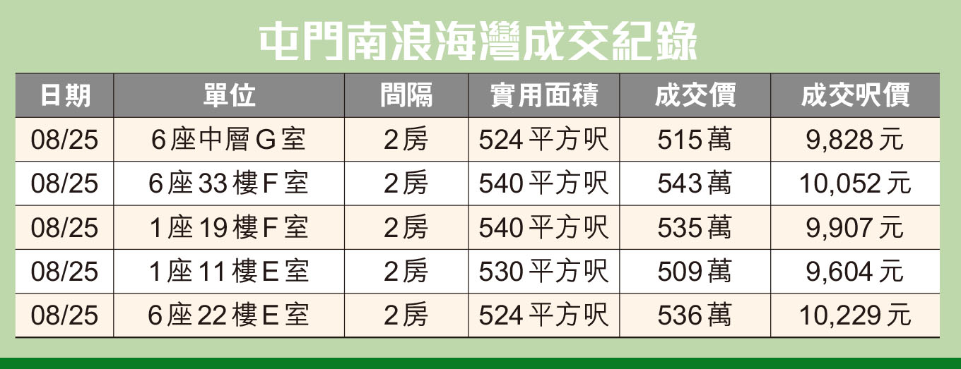 祥益地產區域董事黃慶德表示,南浪海灣8月錄得5宗二手成交個案,實用呎價10,326元。現時屋苑業主放盤約40個。近日同區鄰近的海珠路住宅用地以高於市場價批出,預計會帶動到區內二手成交。他續稱,由於屋苑提供兩房、套三房、三房加工人房等,戶型選擇範圍較闊, 無論是年輕的上車族、同區的分支家庭或換樓的客人均會視屋苑為選擇之一。