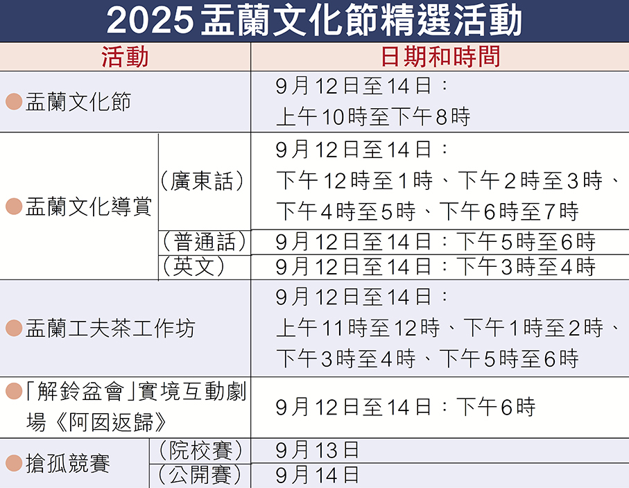 今屆盂蘭文化節由香港潮屬社團總會主辦,以「解鈴盆會」為主題,推出多項精彩活動,包括實境互動劇場《阿囡返歸》、「盂蘭新章」四處抓卡牌遊戲、搶孤競賽、盆供堆疊以及盂蘭文化歷史展覽等。參加者可通過攤位遊戲、工作坊及文化導賞活動收集印章,兌換禮品,寓教於樂。