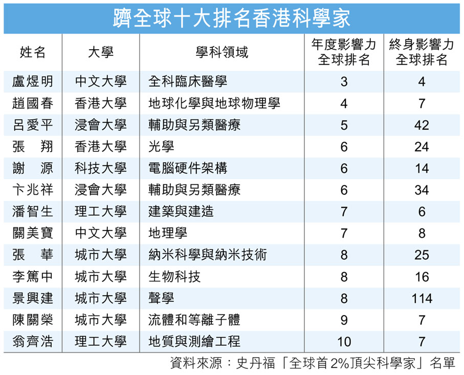 最新年度科學影響力排行榜有1,821名香港學者入選,較前一年1,534人多,主要來自八所資助大學,當中港大、理大、中大,分佔430、370及363人。若撇除自我引用後的綜合分數排名計,共4名香港科學家打入全球首一千名,分別是張華(255),理大土木及環境工程學系安禮信土木工程教授及傑出研究教授潘智生(656),理大建設及環境學院副院長(研究)倪萌(766)及港大理學院地球科學系講座教授趙國春(929)。