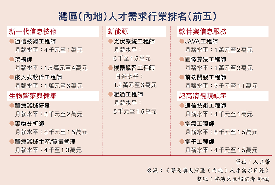 在總決賽開幕式上,主辦方還揭牌成立了國家公共就業服務區域中心(粵港澳大灣區),並發布《粵港澳大灣區(內地)人才需求目錄》(見表),其中,廣東省20個戰略產業集群崗位需求程度排名前五名分別為新一代信息技術、生物醫藥與健康、新能源、軟件與信息服務、超高清視頻顯示,月薪最高可達4萬元,為各大熱門行業的創業項目提供參照。