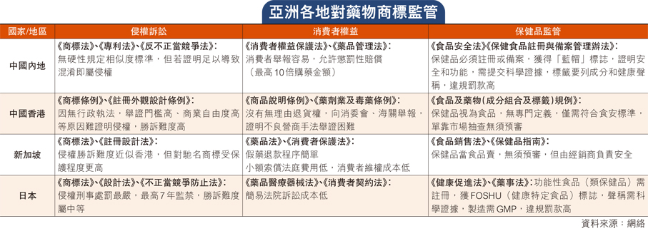 影射藥其本質目的就是借正貨名聲圖利,不惜惡意抄襲、仿冒,更透過一些刁鑽手法逃避法律制裁,不單欺騙了消費者,也傷害了正貨廠商,甚至影響香港藥物零售市場和旅遊業。太和洞藥廠及代理法國雙飛人藥水的全球藥業有限公司多年來沒有放棄向影射藥提告的行動,惟勝訴案件寥寥無幾,更難獲得實質性賠償。太和洞公司指出,內地在此方面則十分值得香港學習,內地《商標法》《專利法》《反不正當競爭法》三管齊下,侵權判定容易,罰則也很重,未計民事賠償的最高數百萬元的賠償,單是認定侵權的行政罰款最高為商標侵權罰款25萬元,外觀設計專利侵權20萬元。 ●香港文匯報記者 廣濟