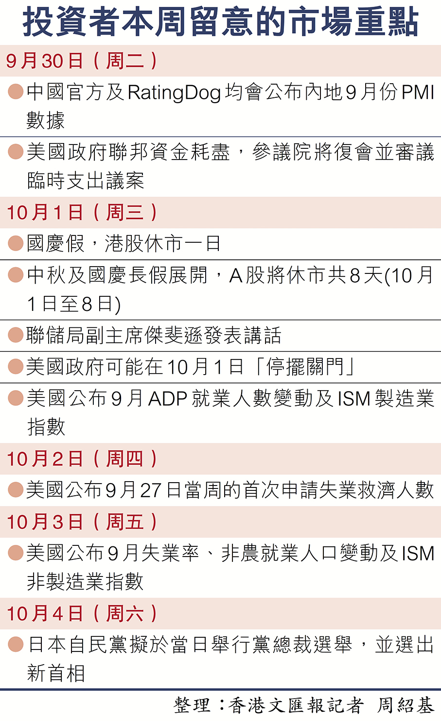 值得關注的,是本周中美有多個經濟數據將公布(見表),包括內地9月份PMI數據,美國公布9月份的就業情況及ISM製造業指數。此外,美國聯邦資金將耗盡,除非國會民主、共和兩黨能及時達成協議,否則美國聯邦政府10月1日將再度「停擺關門」。