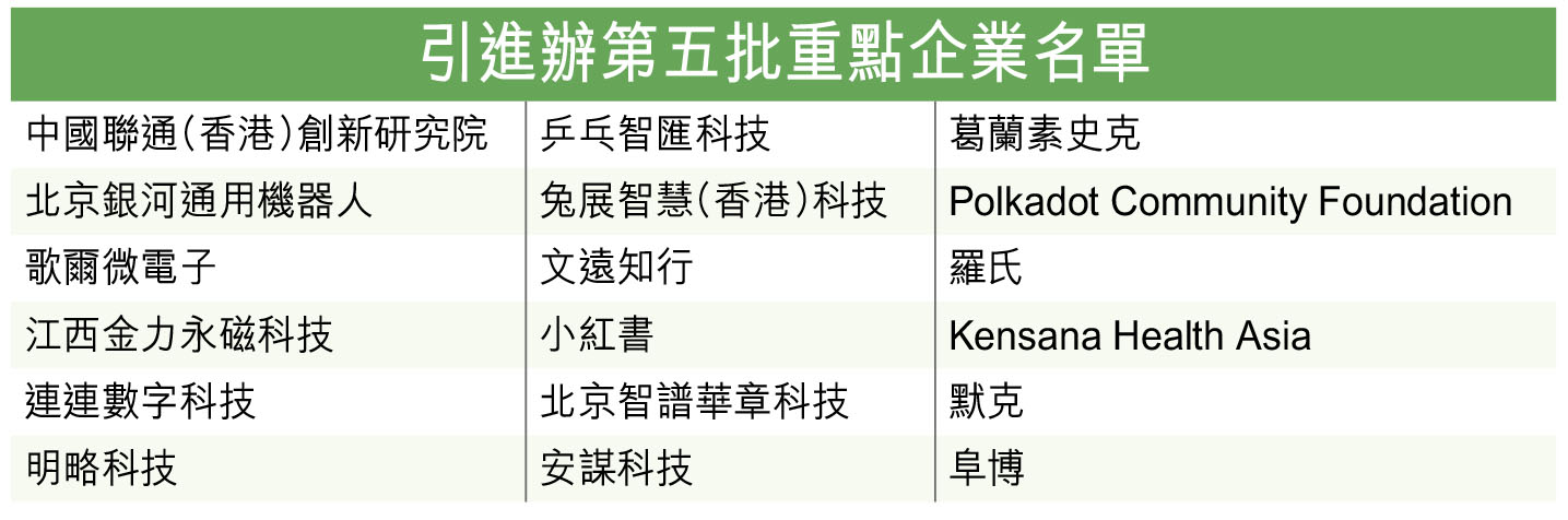 他指出,引進辦專注創科領域的「龍頭」企業,涵蓋5個範疇,包括AI、數據科學、金融科技、生物健康科技、先進製造及新能源,是次新增文創產業。引進辦在考慮重點企業時,除了要求企業承諾在港投入資金並創造職位,亦要考慮企業是否有實體項目落戶香港。目前已引進102家企業,當中近九成會在港建立區域或海外總部,近半數已在港上市,近一成準備在港上市。