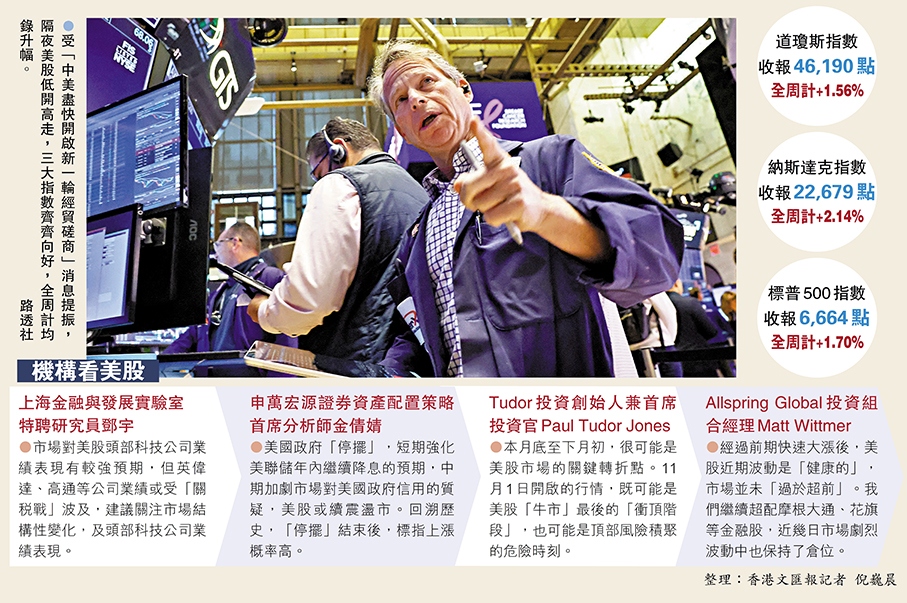 上海金融與發展實驗室特聘研究員鄧宇坦言,受中美關稅對弈因素影響,美股上周呈現震盪市。隨着中美經貿團隊以各種方式展開溝通對話,「關稅戰」升級預期有所降溫,市場情緒的轉好帶動美股信心修復。他續稱,中美關稅問題短期已看到一些緩和措施,雙方經貿團隊溝通頻率的提高,有助於為後續團隊會晤提供更好鋪墊。