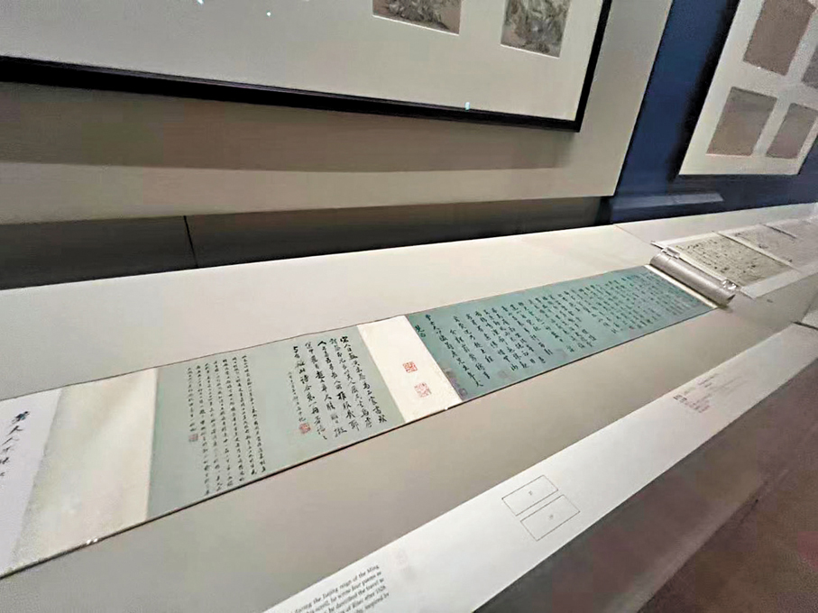 展場中另有一卷嚴嵩草書《遊西山諸寺詩》頗引人注目。嚴嵩作為明代嘉靖年間權傾朝野的內閣首輔,嗜好收藏書畫名跡,也擅長詩詞。此卷共書四首詩作,內容關於他在嘉靖七年遷禮部侍郎後遊覽西山一帶佛寺的經歷,並以此贈其同年進士摯友、松江書法家陸深。作品充分展示其59歲時的書法風格,透過對趙孟頫書風的學習,線條呈現圓潤清麗的特點。此作在民國時期已頗具名聲,卷後有近代著名上海鑑藏家張珩、吳湖帆的題跋,朱樸亦將本作著錄於《省齋讀畫錄》中。