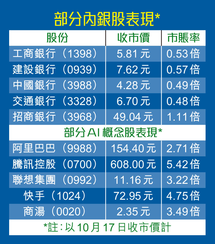 溫傑指出,內銀股經過早前升浪後,市場普遍認為估值偏貴,其後跟隨大市調整後再現吸引力。對於較保守的投資者,大型中資金融股(券商及內房除外)都值得考慮。