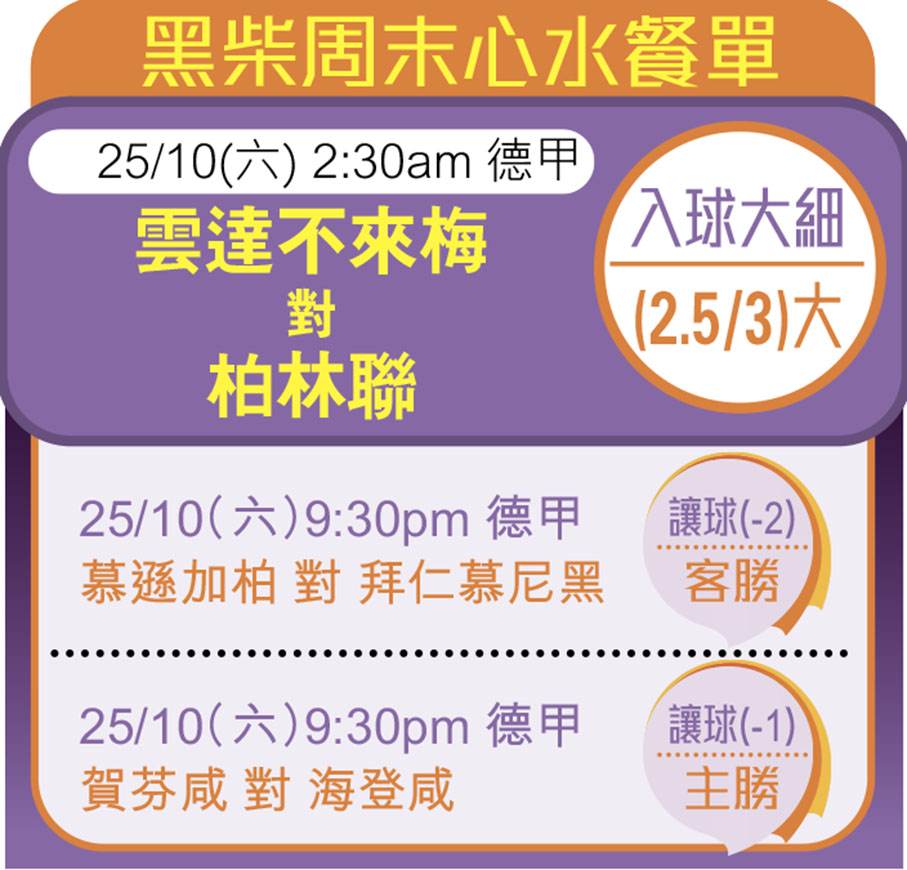 至於今夜率先上演的獨腳戲,雲達不來梅主場對柏林聯(NOW 639台周六2:30am直播)。今季7場周五賽事,共有4場總入球在4球或以上,不來梅及柏林聯都曾參與其中。兩軍防線都有嚴重傷兵問題,但前線卻充滿火力,不來梅新加盟翼鋒麥班古拿愈戰愈勇,天才前鋒尼真馬、上屆頭號射手贊斯史達治同告回勇,加上利華古遜借將邦尼菲斯可以變招,前線可觀;柏林聯首席射手艾耶斯安沙至今已入4球,上輪表現尤其搶鏡。兩軍上季對賽,不來梅主場贏4:1,柏林聯主場和2:2,再追﹝2.5/3﹞大盤。