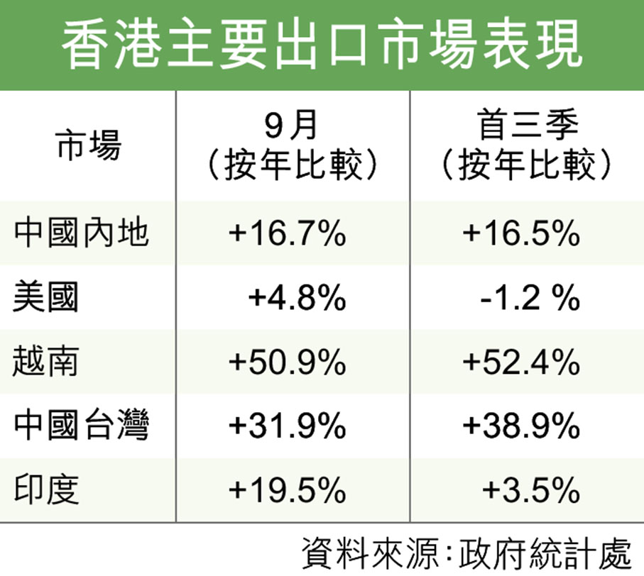 進口方面,來自英國的進口貨值急升70.3%,越南及新加坡分別增長68.7%及33.2%,中國內地和日本則上升19.4%及12.9%。累計首9個月數據,越南市場繼續展現驚人增長潛力,出口及進口分別大幅上升52.4%及79.5%,反映香港與東盟地區的貿易往來日益緊密。