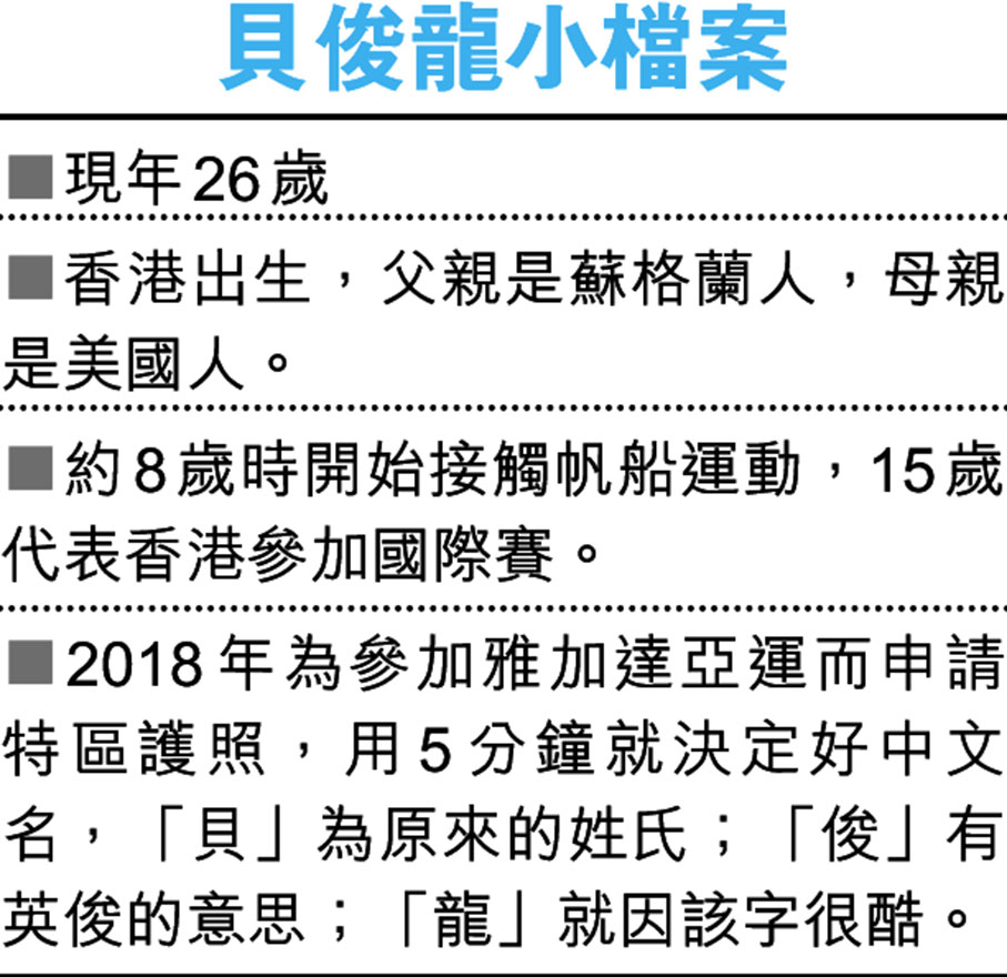 全運帆船賽在廣東海上項目訓練中心舉行,26歲的貝俊龍出戰男子ILCA 7賽事,他在10場賽事中都有穩定表現,取得前四名的七場比賽中有一場是首名衝線。昨日煞科日,貝俊龍在最後一場以第四名衝線,總分33分奪冠,為港隊奪得今屆競賽項目第一金,也是帆船隊全運歷來第一面金牌。