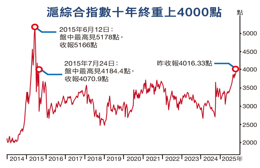 香港文匯報訊(記者 章蘿蘭 上海報道)在中美兩國領導人即將於韓國會晤,料將討論事關中美關係的戰略性長遠性問題,疊加「十五五」規劃建議發布帶來政策利好,消息提振市場情緒下,A股昨日全線走高,滬綜指上揚0.7%,報4,016.33點,終於成功站上4,000點心理關口。深成指上漲1.95%,創業板指拉升2.93%,收回3,300點,北證50指數暴漲8.41%。市場交投活躍,成交額突破2.2萬億元(人民幣,下同),反映投資者信心顯著回暖。