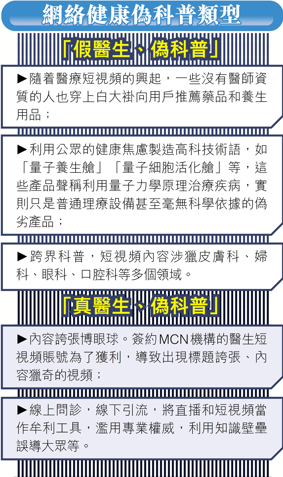 「醫學科普非常重要,這是社交媒體平台給醫務工作者帶來的專業價值社會化的一種效應,但是『偽科學』和『偽科普』不在其列。」中國傳媒大學教授陳欣鋼在接受香港文匯報採訪時表示,當前網絡流行的健康偽科學、偽科普主要形式可以歸為兩大類:第一種是「假醫生、偽科普」,第二種是「真醫生、偽科普」。而這兩種偽科普,幾乎每個網民都曾遇到。