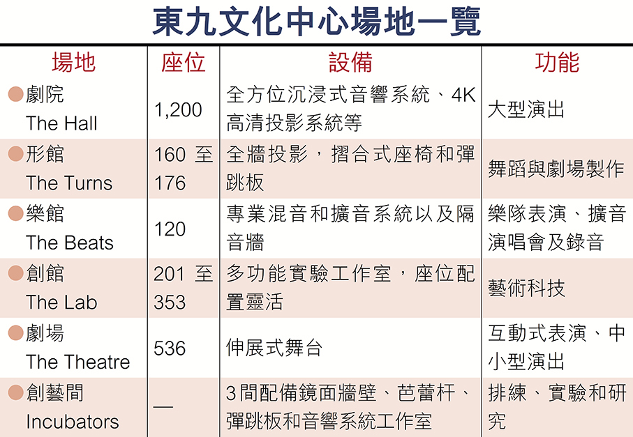 中心配備5個分別可容納120至1,200個座位的表演設施,並搭載先進舞台設備,能全面支援各類演出。為支持業界創作,中心特別預留劇院用於長期演出用途,推動演藝可持續性發展。去年8月以來,中心成功舉辦20套合共500場「東九開箱」試場節目活動,吸引逾200名演藝、科技專才參與,累計接待觀眾超1.3萬人次,為正式啟用奠定堅實基礎。