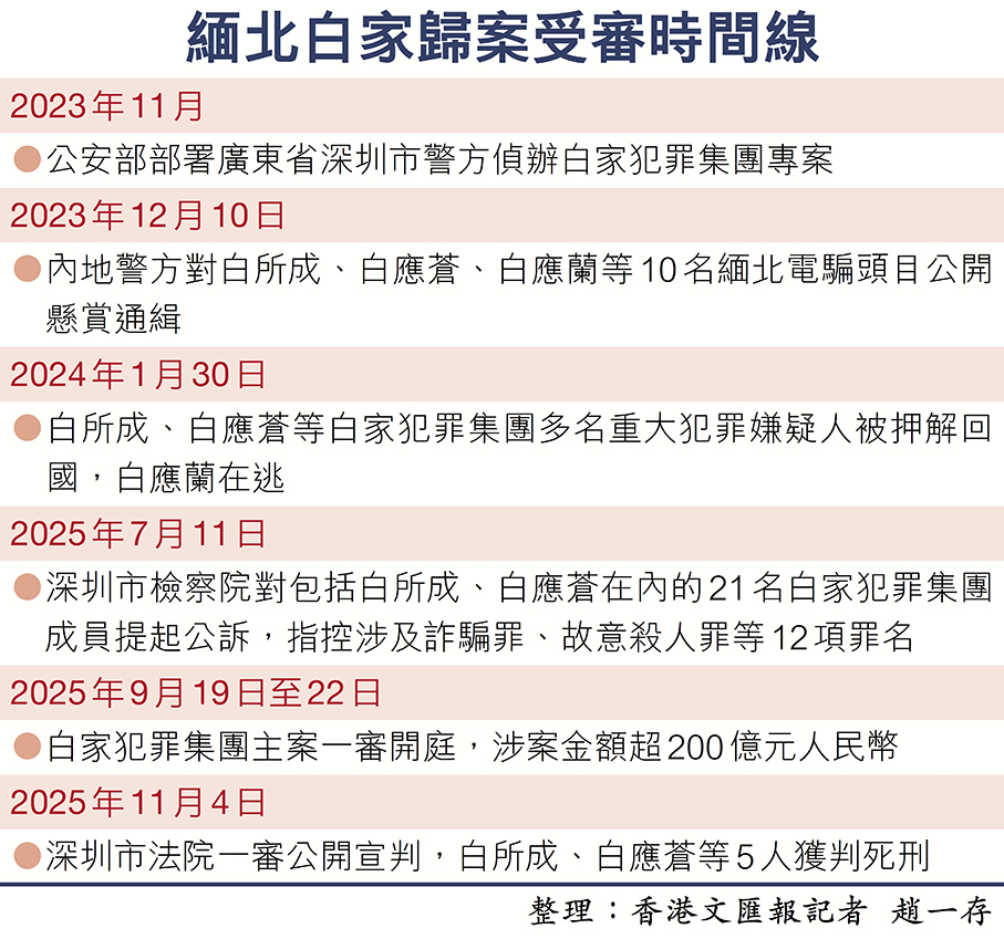 香港文匯報訊(記者 趙一存 北京報道)廣東省深圳市中級人民法院4日一審公開宣判緬北白家犯罪集團案,對白所成、白應蒼等5名被告人判處死刑。審理查明,白家犯罪集團夥同「金主」實施電信網絡詐騙、故意殺人等犯罪活動,涉賭、騙等資金290餘億元(人民幣,下同),造成6名中國公民死亡。販賣製造毒品約11噸。法院認為,被告人白所成、白應蒼等人的行為分別構成詐騙罪、故意殺人罪、故意傷害罪等12項罪名,根據其犯罪事實、情節及危害程度作出死刑判決。