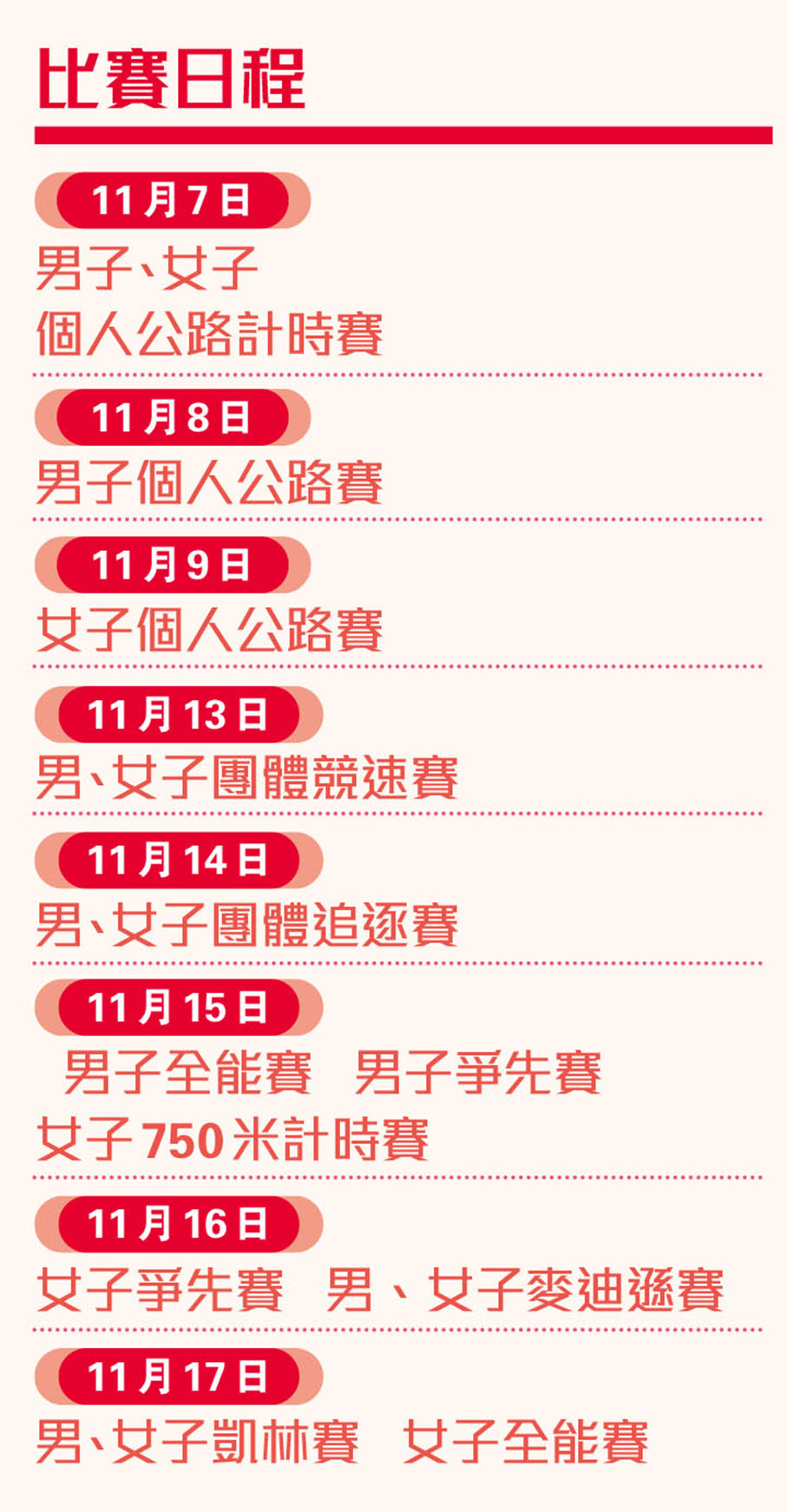 第十五屆全國運動會場地單車項目將於11月13日至17日假香港單車館舉行,在11月8日舉行的男子公路賽亦有部分路段途經香港。單車隊在本港歷來奪得的47面全運會獎牌當中,就佔去其中10金4銀9銅,是名副其實的獎牌大戶。今屆港隊以「小女車神」李思穎為首的新一代出戰,矢志延續過往七屆賽事「每屆必有金」傳統,將車神傳奇代代傳承!