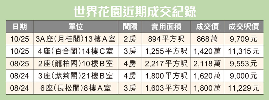 過去一個月,世界花園暫錄得兩宗二手成交,實用成交呎價為10,647元。美聯物業瑞峰分行客戶總監吳美蓮表示,現時屋苑共有12個二手放盤,實用平均呎價為11,652元。屋苑乃大圍半山名牌豪宅,單位間隔巨房巨廳,是次放盤單位為第五座中層單位,叫價1,498萬元連車位。