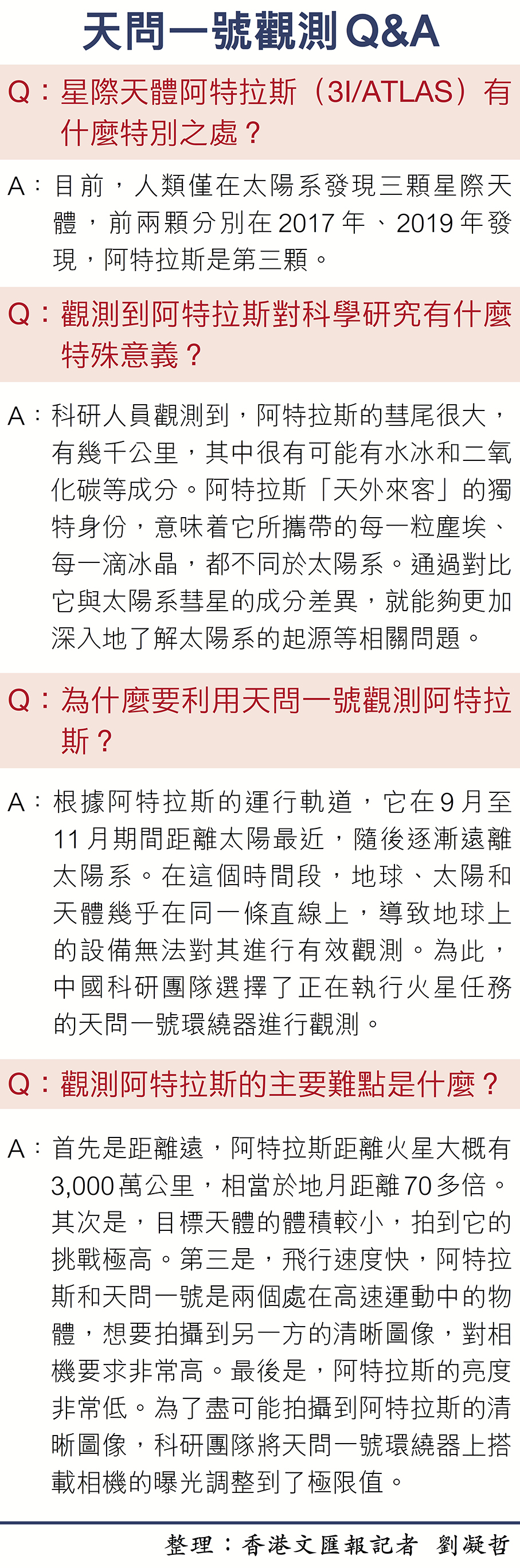 香港文匯報訊 綜合記者劉凝哲及新華社報道,國家航天局11月6日宣布,天問一號環繞器利用高分辨率相機於近日成功觀測到星際天體——阿特拉斯(3I/ATLAS)。阿特拉斯是人類已知造訪太陽系的第三顆星際天體,推測年齡約30億至110億年,也是中國航天器首次觀測到星際天體。觀測期間,天問一號環繞器距離目標天體阿特拉斯約3,000萬千米,是目前觀測該天體距離最近的探測器之一。