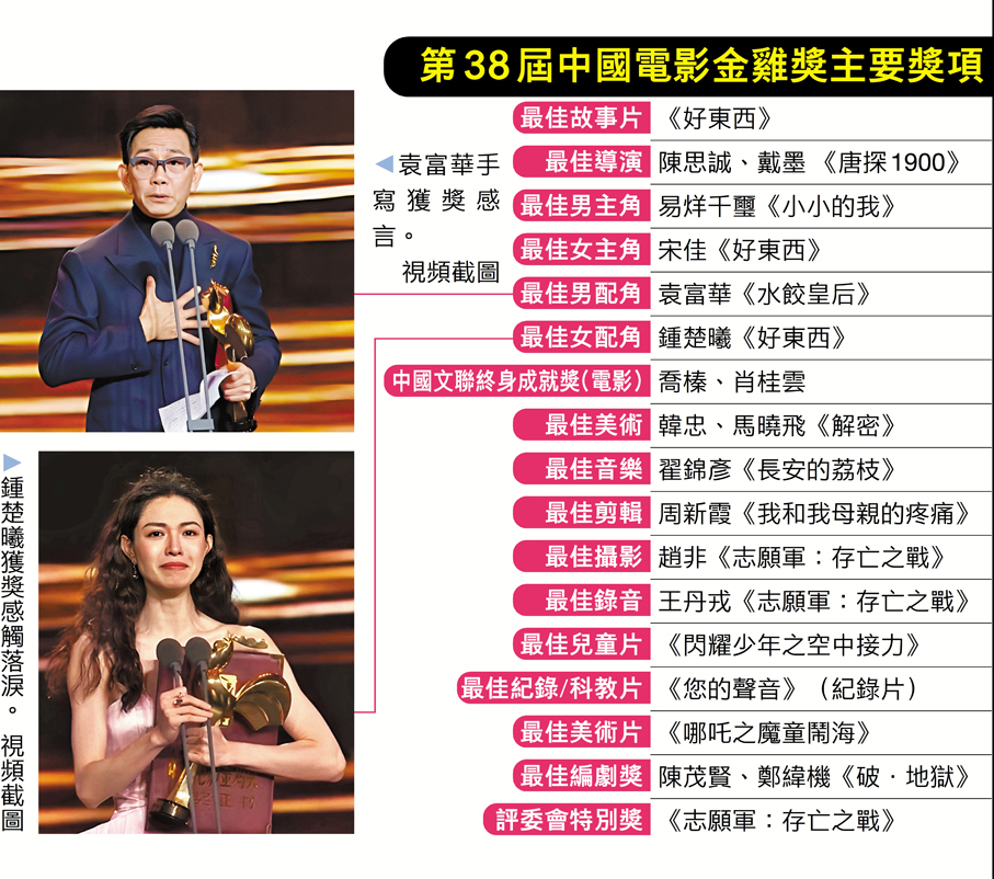 香港文匯報訊(記者 蔣煌基、安夏 廈門報道)第38屆中國電影金雞獎頒獎典禮昨晚在廈門舉行。本屆頒獎禮凸顯了行業新老交替的趨勢,24歲的易烊千璽憑藉在《小小的我》中飾演劉春和一角,四度提名後終奪最佳男主角,成為金雞獎史上最年輕的影帝之一;宋佳時隔12年再奪金雞影后,其主演的電影《好東西》獲得最佳故事片、最佳女主角和最佳女配角三項大獎,成大贏家。
