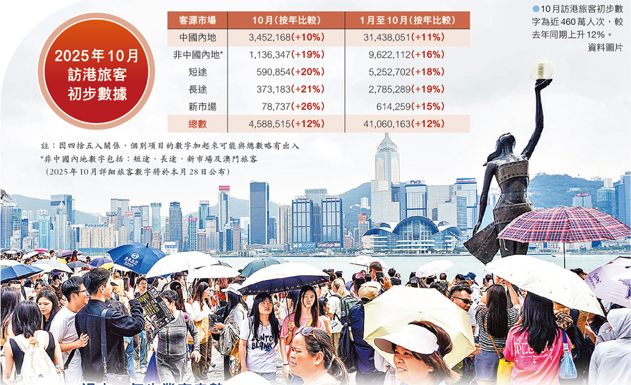 香港特區政府多管齊下拚經濟,漸見收成,其中旅遊業頻頻報捷。香港旅遊發展局昨日公布上月錄得460萬訪客人次,按年升12%;今年首十月累計錄得4,100萬訪港旅客人次。旅遊業界相信,隨着聖誕新年及盛事活動集中在年底舉行,全年4,900萬人次旅客量的目標指日可待。旅遊業作為經濟火車頭,能拉動百業復甦,惠及一般打工仔也有感,經濟學者預期,在旅遊業帶動下,今日(18日)公布的失業率有望緩和,甚至見頂回落,零售及飲食業最受惠。在經濟回暖、股票市場交投活躍下,德勤(Deloitte)預期,2025/26年度特區政府有望「滅赤」達至收支平衡,甚至可能錄得輕微盈餘(見A10)。 ●香港文匯報記者 劉明