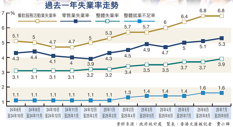 今年7月至9月的失業率升至3.9%,為近3年最高,當中餐飲服務活動失業率由去年11月至今年1月的4.7%,持續升至今年6月至8月及7月至9月的6.8%,而7月至9月的零售業失業率則持續5.3%水平(見圖)。不過,今年9月零售業總銷貨價值臨時估計為313億元,較去年同月增加5.9%。財政司司長陳茂波前日預告今年經濟持續向好,在金融市場暢旺、零售向好和旅客增加等因素下,相信今日公布的失業率將緩和甚至下調。