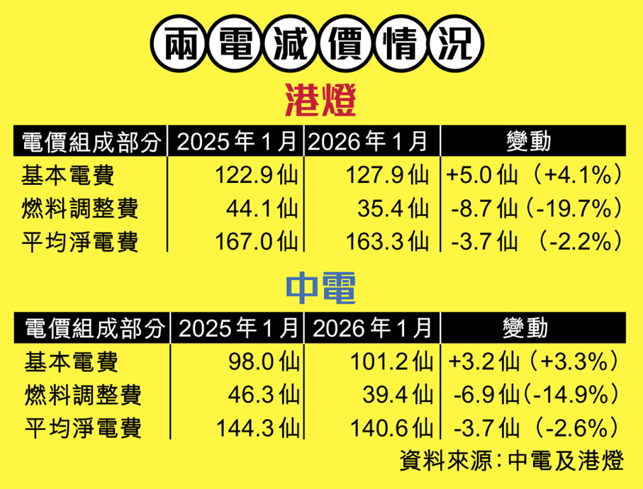 在國際燃料價格緩和下,香港市民明年可獲減電費,對於基層市民而言,如同獲派粒糖。環境及生態局局長謝展寰昨日聯同兩間電力公司代表公布,明年元旦起兩電的基本電價上調,但燃料調整費下調,一加一減下,中電將下調平均淨電費2.6%至每度電140.6仙;港燈亦下調平均淨電費2.2%至每度電163.3仙。以一個每月用電量為275度的典型三人家庭,每月電費將較今年的批准電費率減少支付10元。