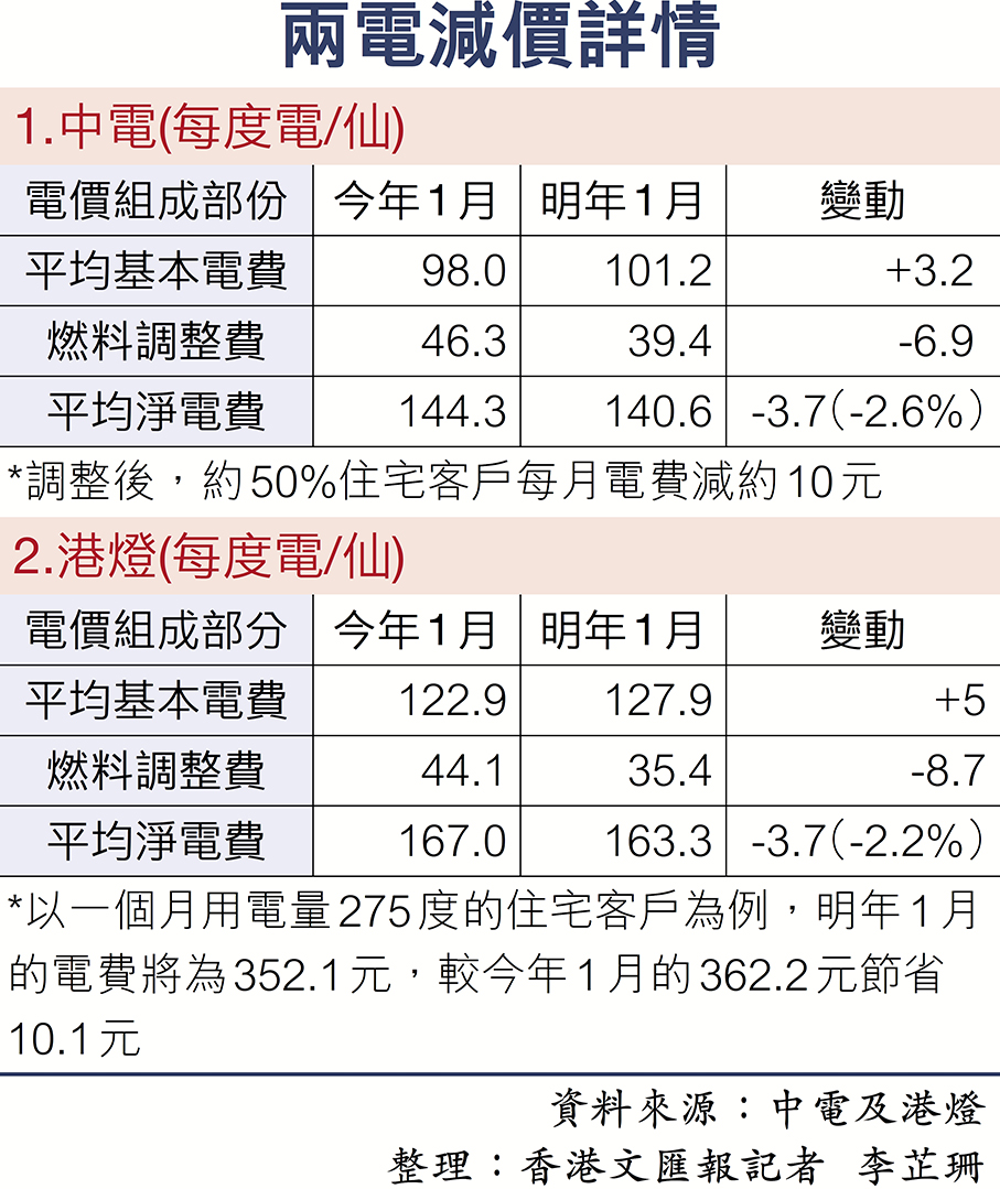 目前電費由基本電價及燃料費組成。中電總裁羅嘉進表示,面對營運成本上升壓力,明年起平均基本電價會由每度電98仙上調3.2仙至101.2仙,但受惠於國際燃料價格緩和平穩,燃料調整費將下調6.9仙至每度電39.4仙,平均淨電費由今年的每度電144.3仙下調至140.6仙,減幅為2.6%。