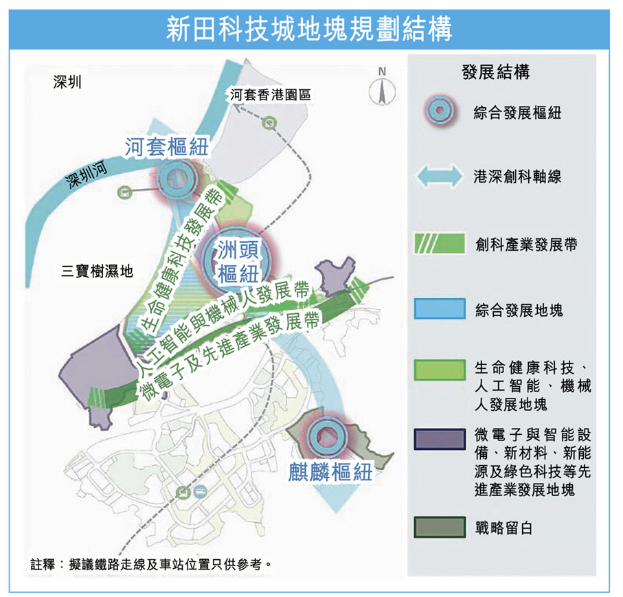 用地布局包括「三個樞紐、三個產業發展帶」,即由北至南的河套樞紐、洲頭樞紐及麒麟樞紐,以及生命健康科技發展帶、人工智能與機械人發展帶、微電子與先進產業發展帶。五個發展階段包括產業初步導入階段;為科研成果轉化提供產業鏈中下游延伸空間的產業生態延展階段;打造新田科技城標誌性綜合功能區域的新田產城中樞階段;大規模建設新田科技城主區的產業完善階段;及最後預留發展彈性的戰略留白階段支援未來新興科技產業。
