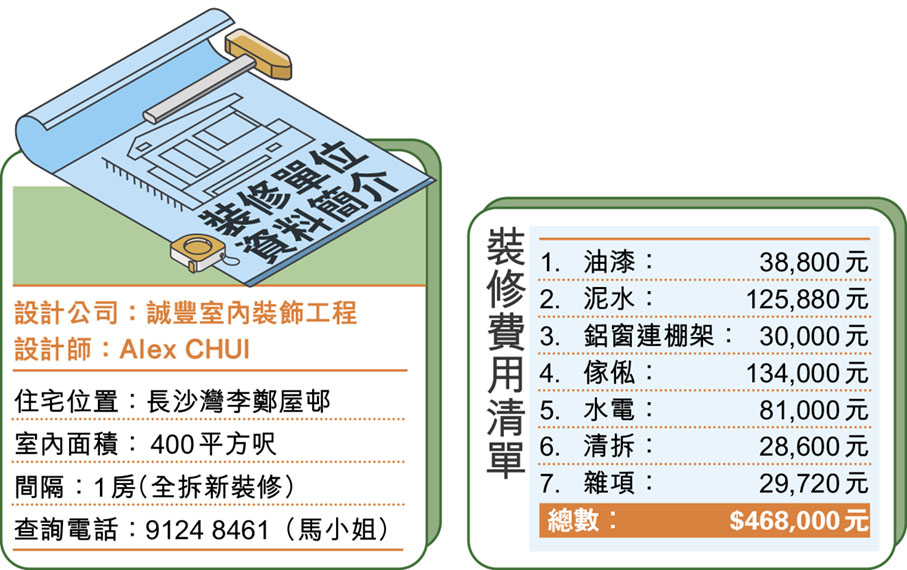 設計師Alex按照客人喜歡的風格進行了設計,並運用了現場的空間盡量令視野廣闊,因為單位現在居住的人數減少了,所以只需要做一間房,另外在旁邊做了一個大趟門的窗戶作為書房,平時不用書房的時候就可以將大趟門推開,這樣能將窗戶的陽光滲透入屋。另外客人特別注重廚房間隔,閒時喜歡煮幾味,希望廚房裏面應該有的爐具都能放進細小的空間裏面,而且購買了一個大型雪櫃,所以設計師特地將門口位置的牆身拆了,偷位放了大型雪櫃。