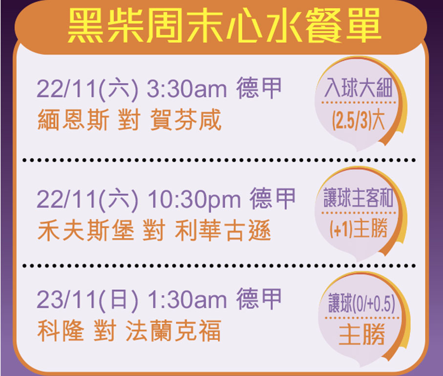 至於今晚深夜獨腳戲,緬恩斯主場對賀芬咸(NOW 639台周六3:30am直播)。緬恩斯淪落尾二要出力救亡,難得有國際賽期回氣加上大將艾美利傷癒復出,強項主場必然搶攻。只是防線太差,近21場德甲賽事全部有失波,今仗難保清白之身;賀芬咸德甲4連勝而且每仗都攻入3球,狀態大勇作客特佳,有足夠條件同緬恩斯駁火,吼﹝2.5/3﹞大盤。