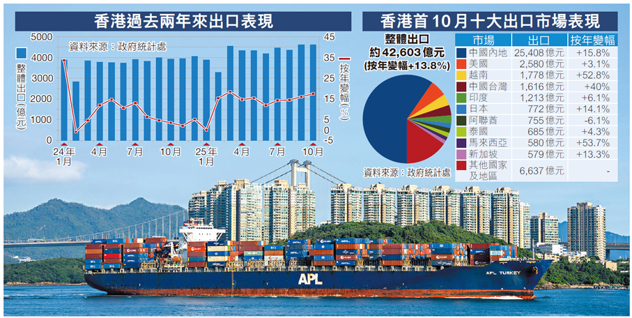事實上,自4月美國向全球貿易夥伴加徵額外關稅後,中美兩國不斷互加關稅至歷史高位(145%),雙方在一個月後於瑞士日內瓦達成「貿戰休兵」協議,為兩國貿易談判設定90天休戰期,原定於8月12日結束。至8月11日,白宮宣布,美國總統特朗普簽署行政命令,將美國對華關稅的暫停期再延長90天,即將於11月到期。市場分析指,這或令不少出口商有「搶先出口」的情況。同時,蘋果公司今年9月發布的iPhone17新系列手機,受到市場高度關注,各地銷售表現強勁,新手機付運也帶動本港10月的出口表現。