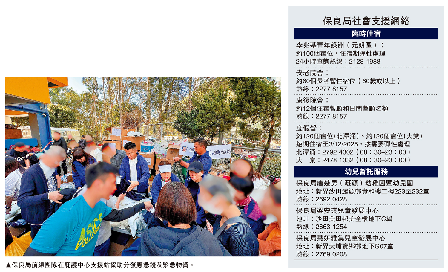保良局專屬社工團隊正協助向受災市民,包括受影響屬校及單位家庭提供情緒支援,並配合社署調配作適時支援。