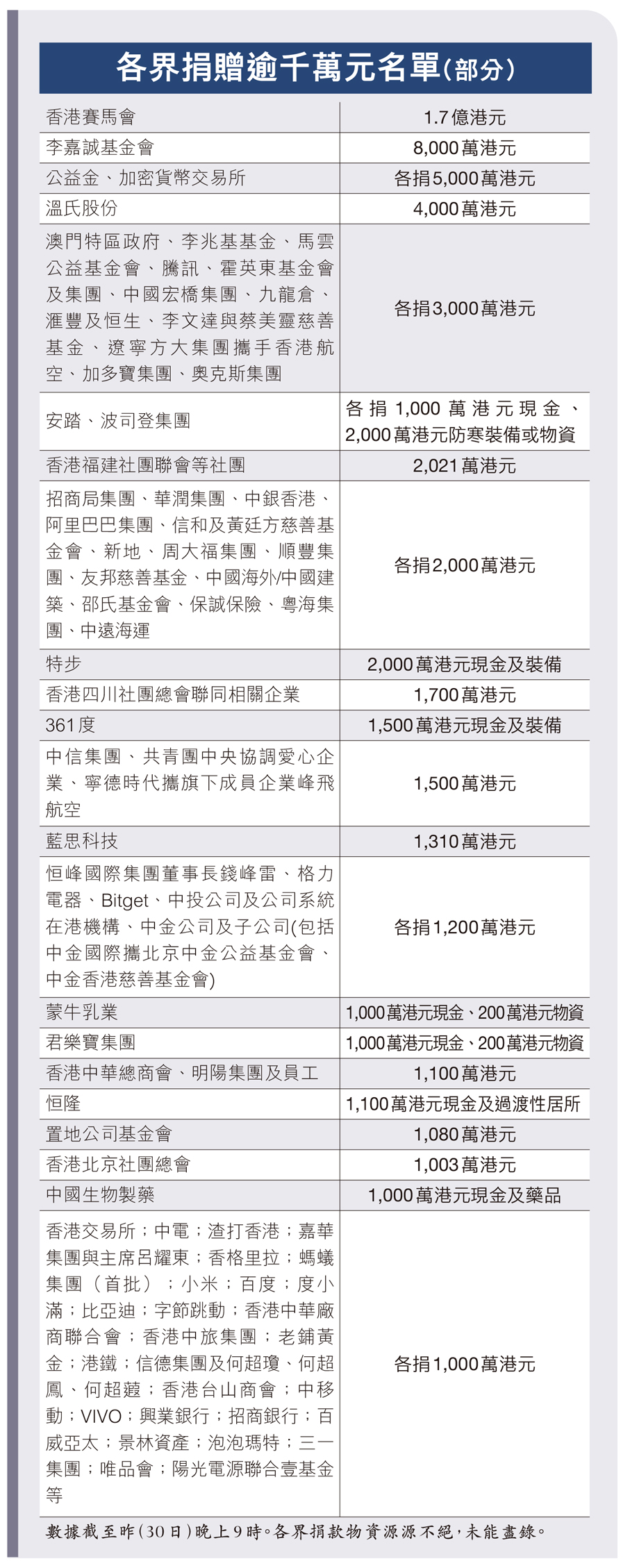 香江有難 八方支援 各界捐款總額近30億