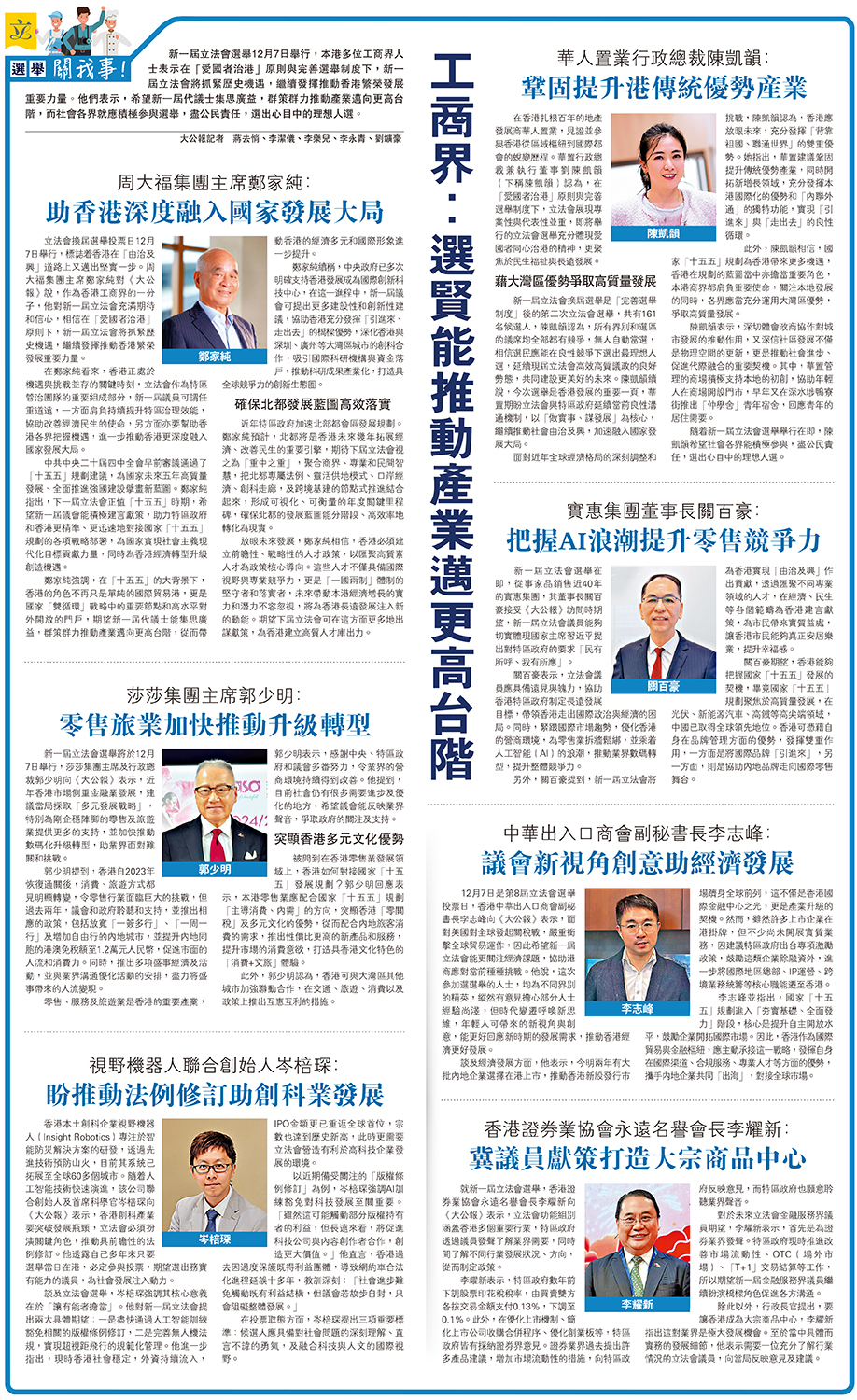 新一屆立法會選舉12月7日舉行,本港多位工商界人士表示在「愛國者治港」原則與完善選舉制度下,新一屆立法會將抓緊歷史機遇,繼續發揮推動香港繁榮發展重要力量。他們表示,希望新一屆代議士集思廣益,群策群力推動產業邁向更高台階,而社會各界就應積極參與選舉,盡公民責任,選出心目中的理想人選。\大公報記者 蔣去悄、李潔儀、李樂兒、李永青、劉鑛豪