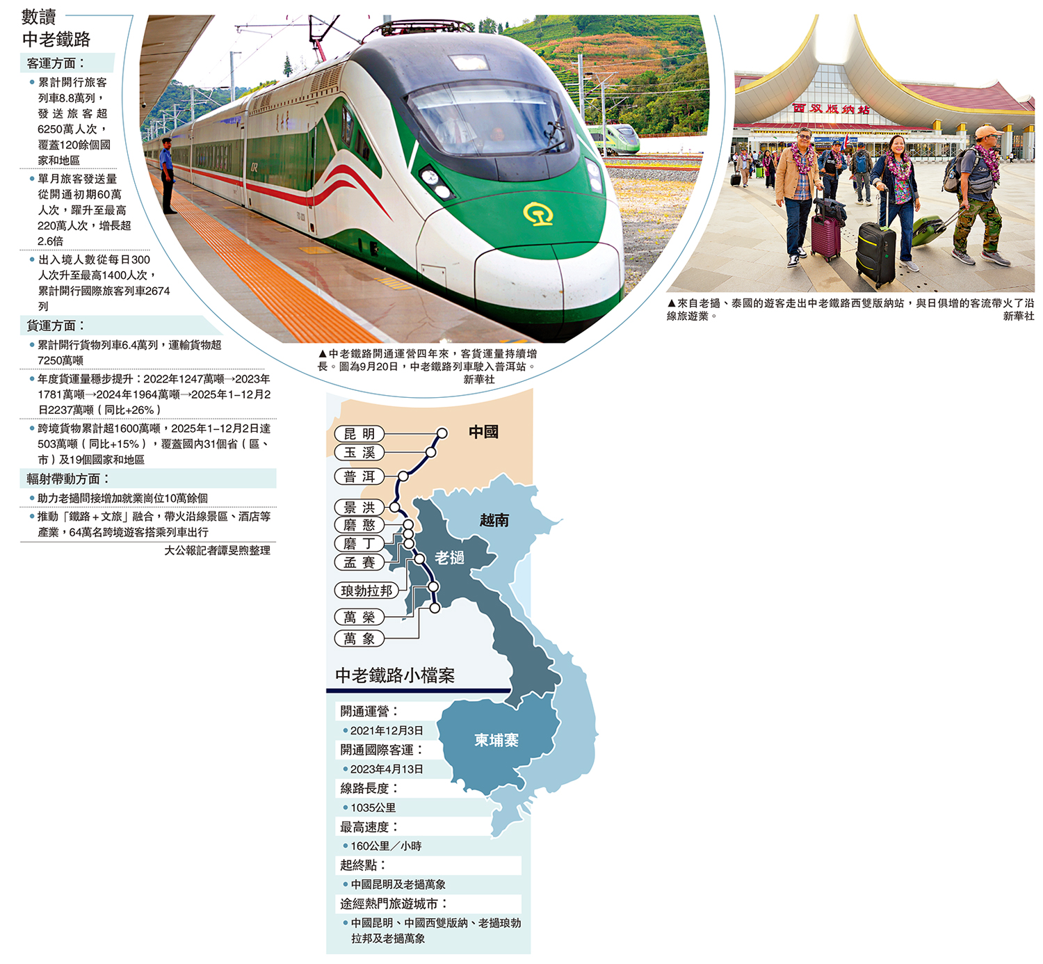 記者從中國國家鐵路集團有限公司(下稱國鐵集團)獲悉,截至12月2日,中老鐵路開通運營滿四年,累計發送旅客超6250萬人次、貨物超7250萬噸,昆明經老撾至泰國的貨運成本降低30%至50%,老撾境內運輸成本降低了20%至40%,「黃金大通道」效應持續放大,為區域經濟發展提供了「新引擎」。